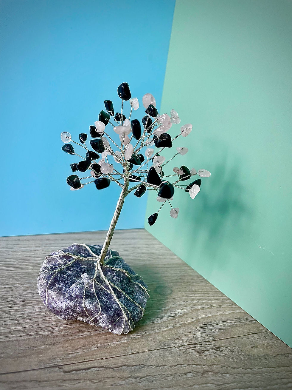 “Peaceful Night” Rose Quartz/Onyx & Silver Wire Tree on Lepidolite Base
