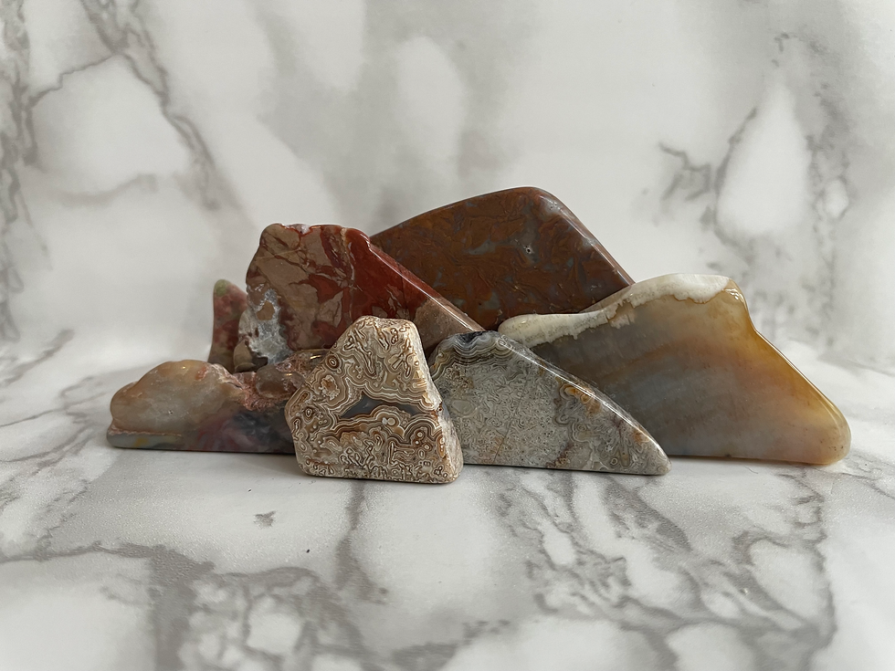 Genuine polished slabs of semiprecious stones puzzled together to create mini organic sculptures reminiscent of mountain ranges