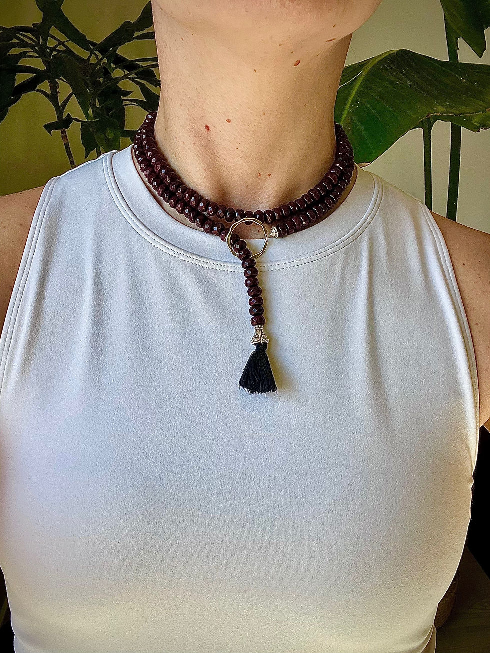 Gold Garnet Sleek Lariat Necklace with Black Tassel