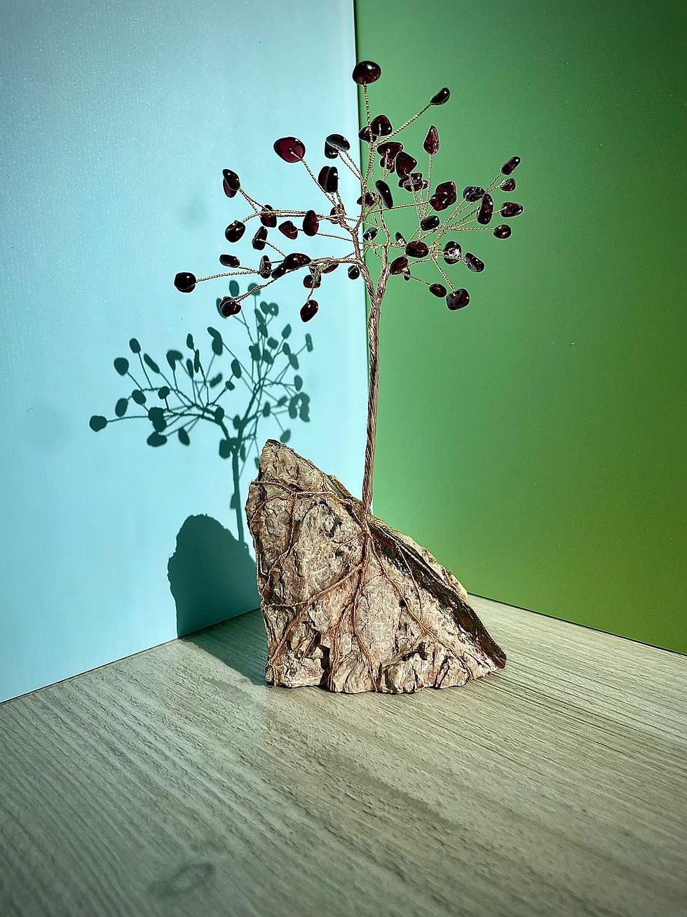 Wire tree sculptures with semiprecious stone leaves on a variety of genuine stone, fossil, and mineral bases